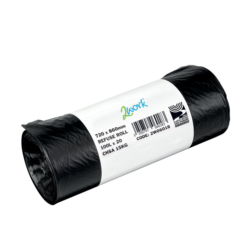 2Work Refuse Sack 100 Litre Black 20 Bags per Roll (Pack of 10) 2W06018