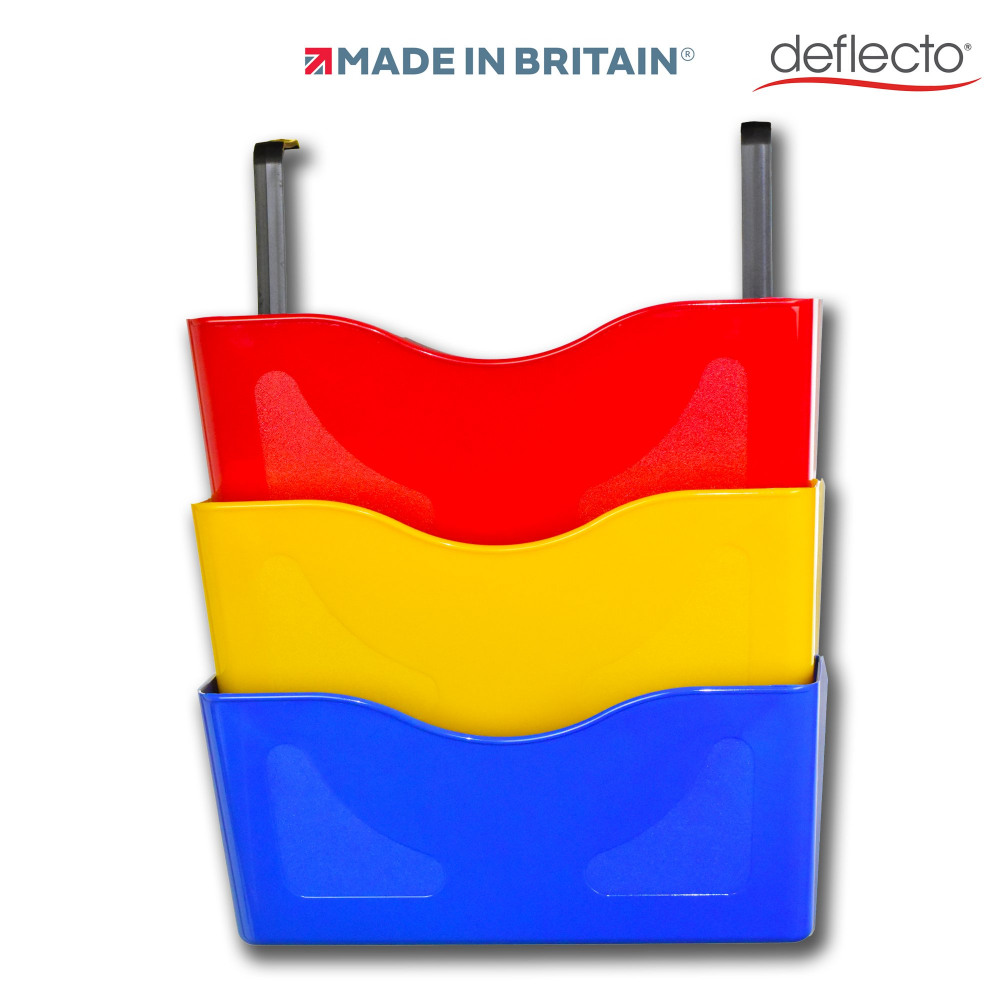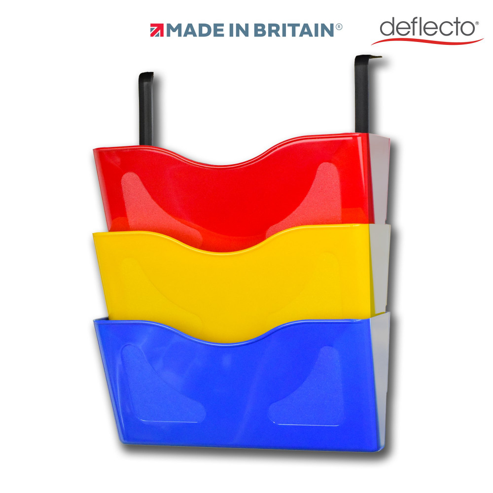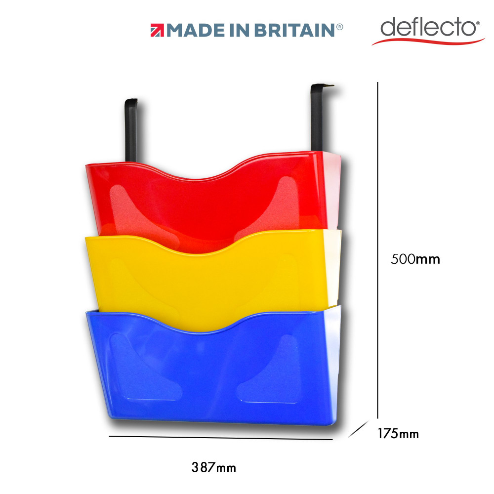 Deflecto 3 x A4 Landscape Wall Pocket Literature File with Hanging Bracket Red/Yellow/Blue - CP077YTRYB
