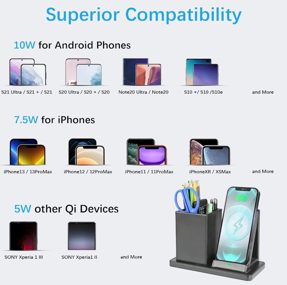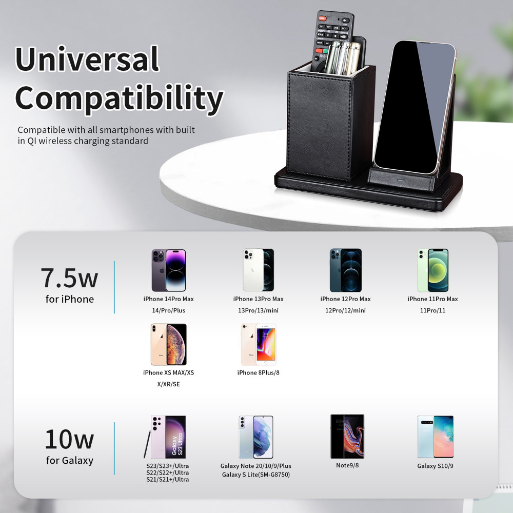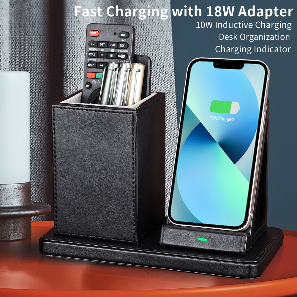 - STYLISH DESIGN: This wireless charging pen holder surface is made of high quality PU leather and designed with stitched detailing. It's waterproof and easy to clean. The wireless charging station can keep your home and office looking stylish and will be a perfect gift for your parents, friends, workmates