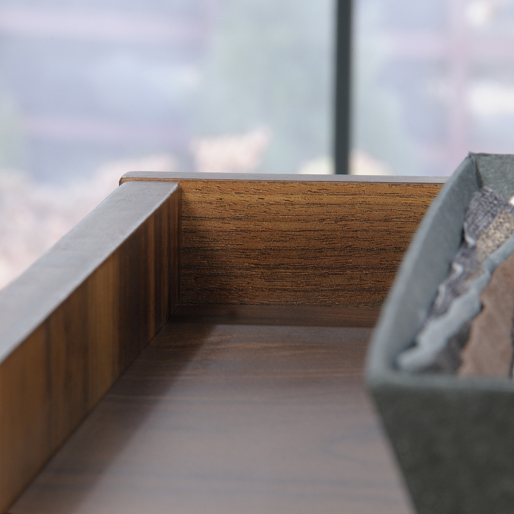 - Adjustable shelf discreetly hidden behind a door and open fixed shelf for additional storage
