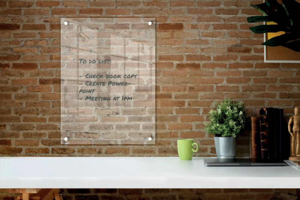 - The clear acrylic mini whiteboard is wall mounted using stylish through corner mounts in a portrait or landscape format