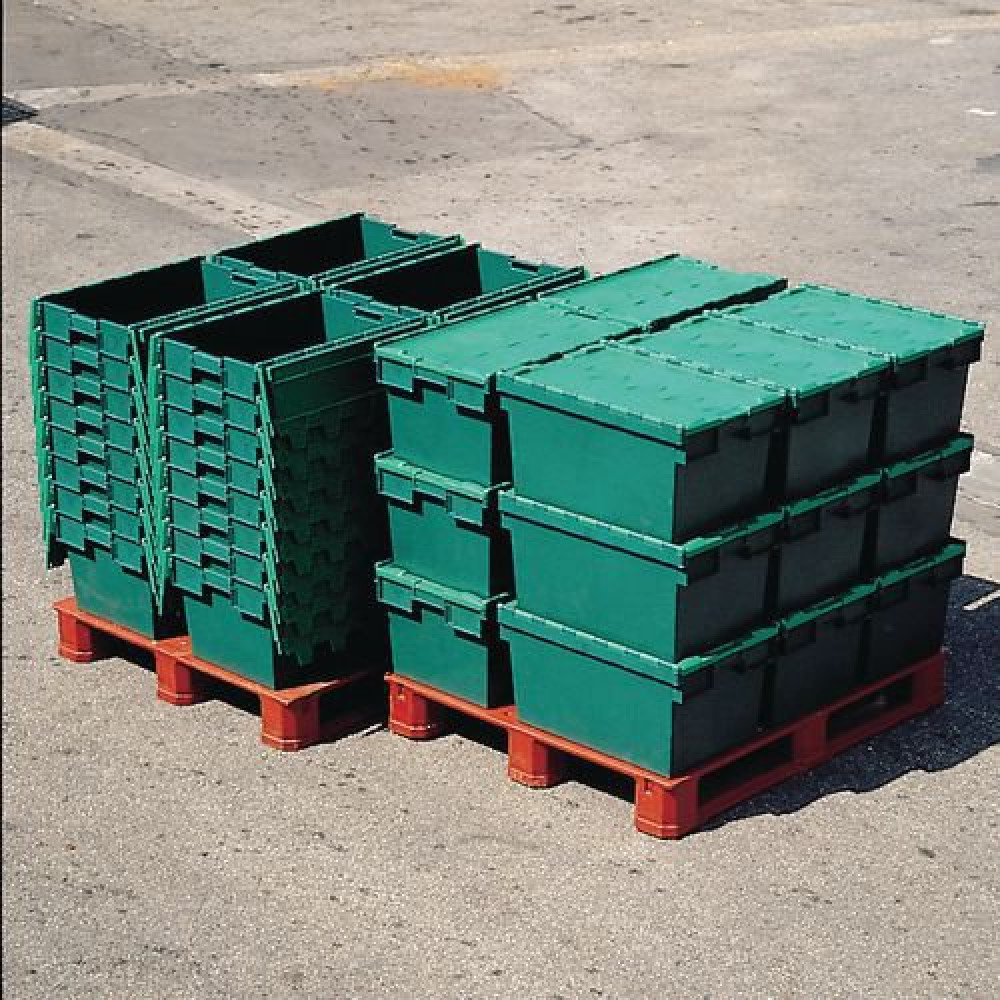- Polypropylene distribution containers with integral hinged lids