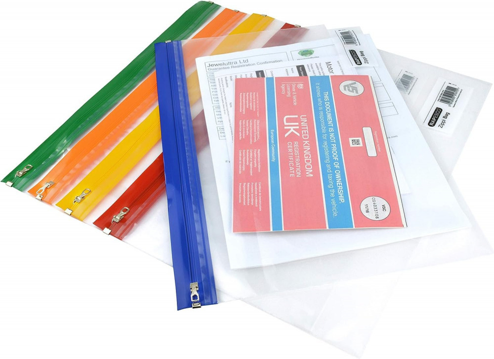 - Clear transparent bags with coloured metal zips to keep documents secure
