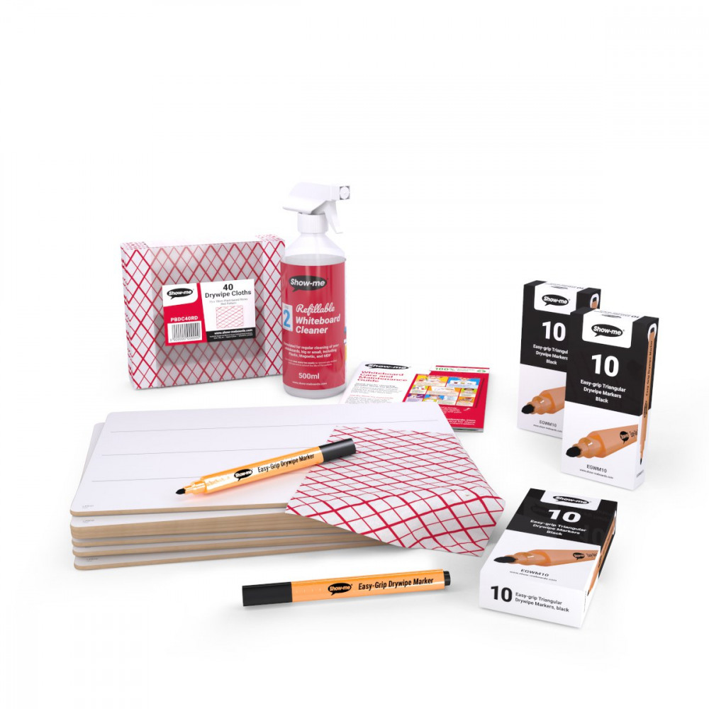 • Pack contains, 30 boards in lined, 30 Triangular pens and 40 Cleaning Cloths, with a free cleaner