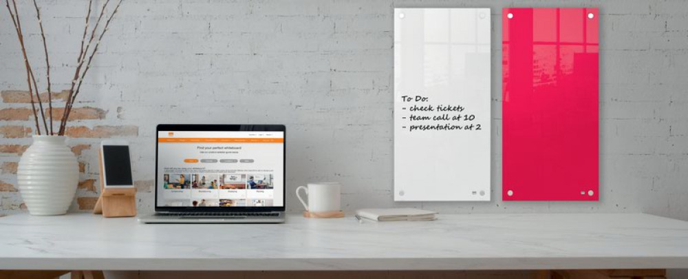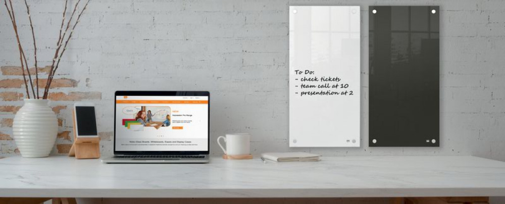 - Dry erase slim glass whiteboard panel in portrait or landscape format, with a stylish frameless design