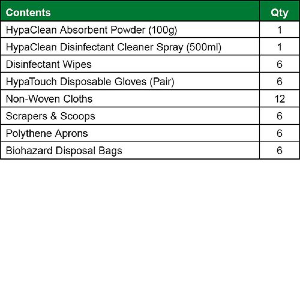 - All kits contain disinfectant spray, HypaClean Disposable Clean Up Packs and absorbent granules with deodoriser