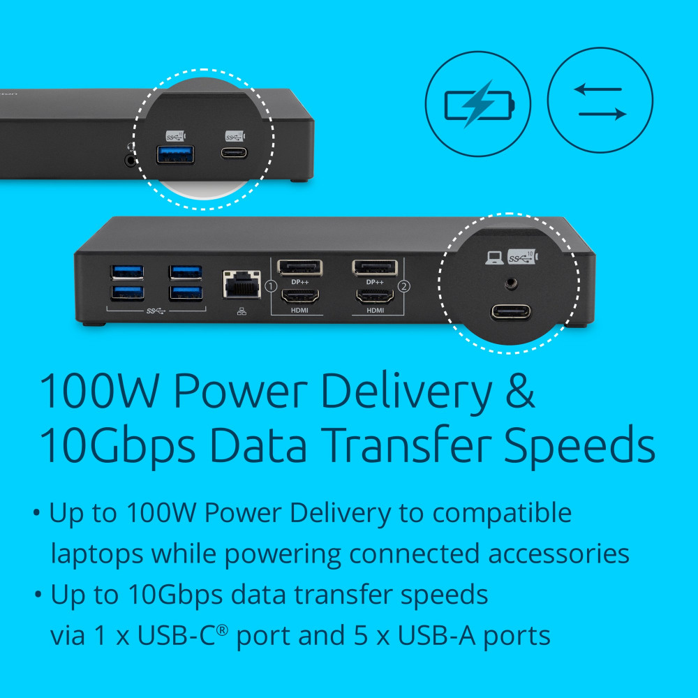 - Up to 100W Power Delivery to compatible laptops while powering connected accessories