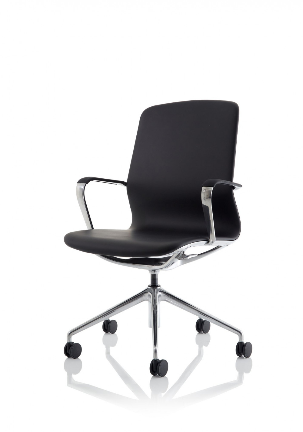 - Elegant Design: The Lucia Medium Back Executive Office Chair features a sophisticated and modern design, with black vegan leather upholstery and a polished aluminum frame, arms, and 5-star base, adding a touch of class to any office environment.
